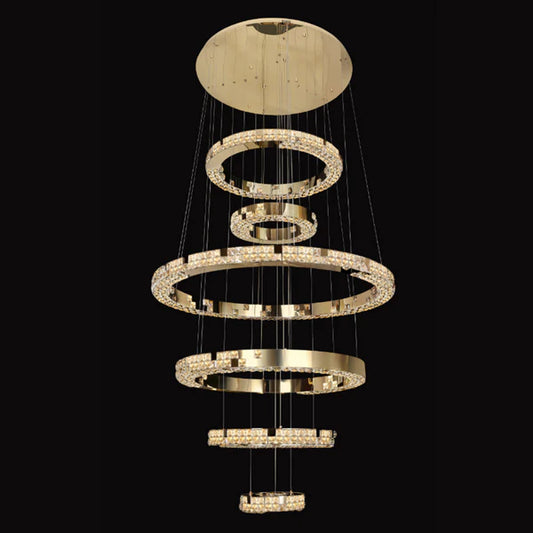 Modern Luxury 5-Ring Crystal Chandelier in Gold Finish for Staircase