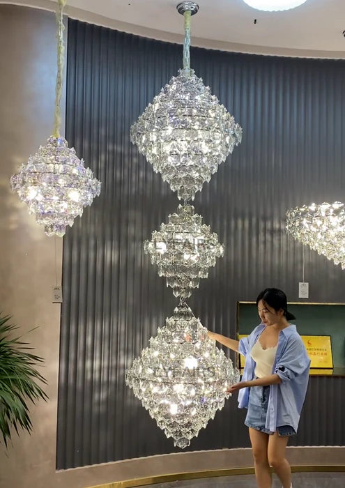 Lustre en cristal de luxe à trois ou quatre cônes pour escalier, hall d'entrée ou hôtel