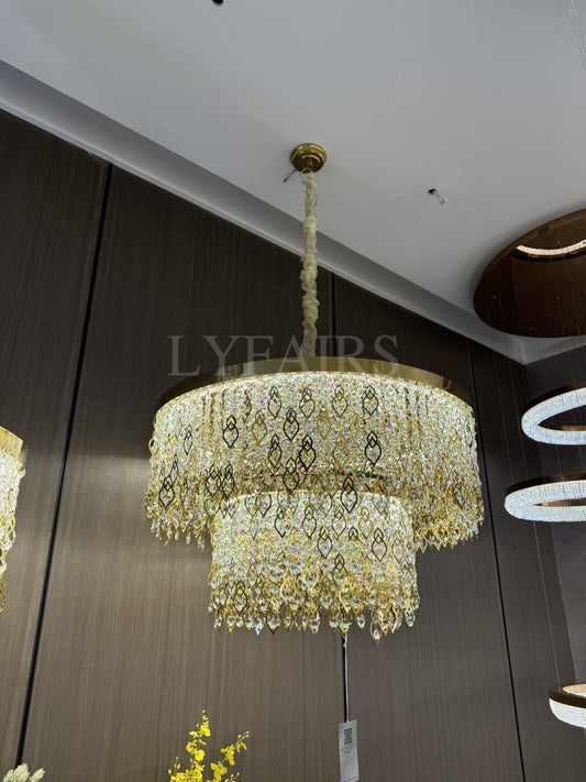 Lustre rond élégant en cristal avec pampilles dorées pour plafonds bas