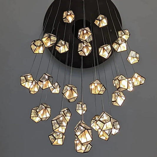 Lustre suspendu à plusieurs gouttes en diamant à taille irrégulière, finition laiton antique