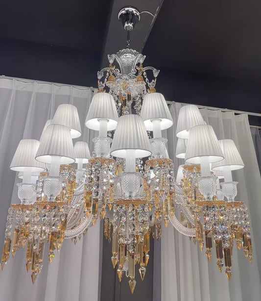 Grand lustre de luxe classique à plusieurs niveaux en cristal jaune avec abat-jour en forme de bougie pour pièces à haut plafond/salon