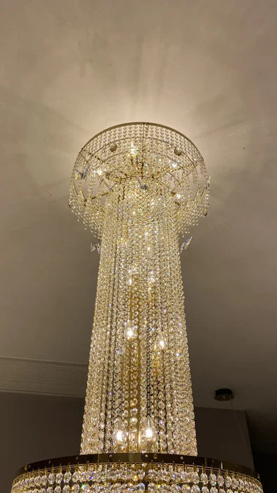 Lustre en cristal de luxe surdimensionné de style européen à plusieurs niveaux avec finition dorée, luminaire décoratif en cristal papillon artistique pour hall d'entrée/escalier