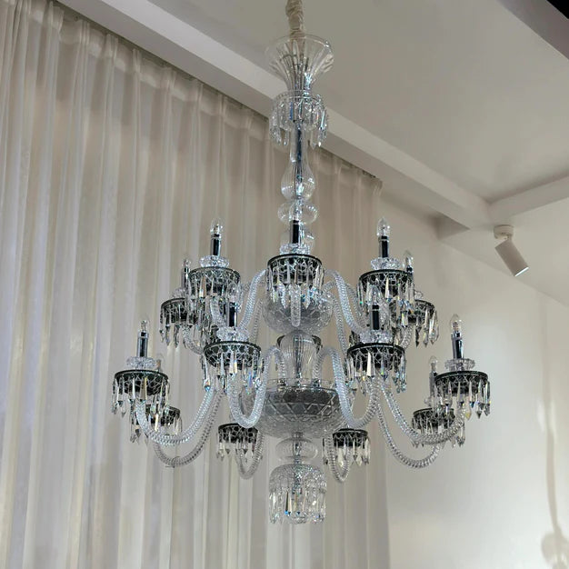 Le corps du luminaire est entièrement réalisé en cristal et métal de haute qualité. Son design luxueux et moderne en fait un objet d'une beauté saisissante, qu'il soit allumé ou éteint.