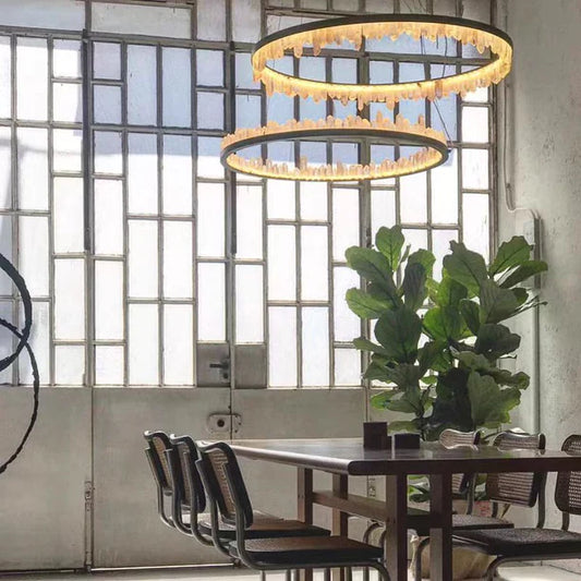 Lampadario in stile moderno con anelli in ottone e cristallo di quarzo naturale, finitura ottone/nero