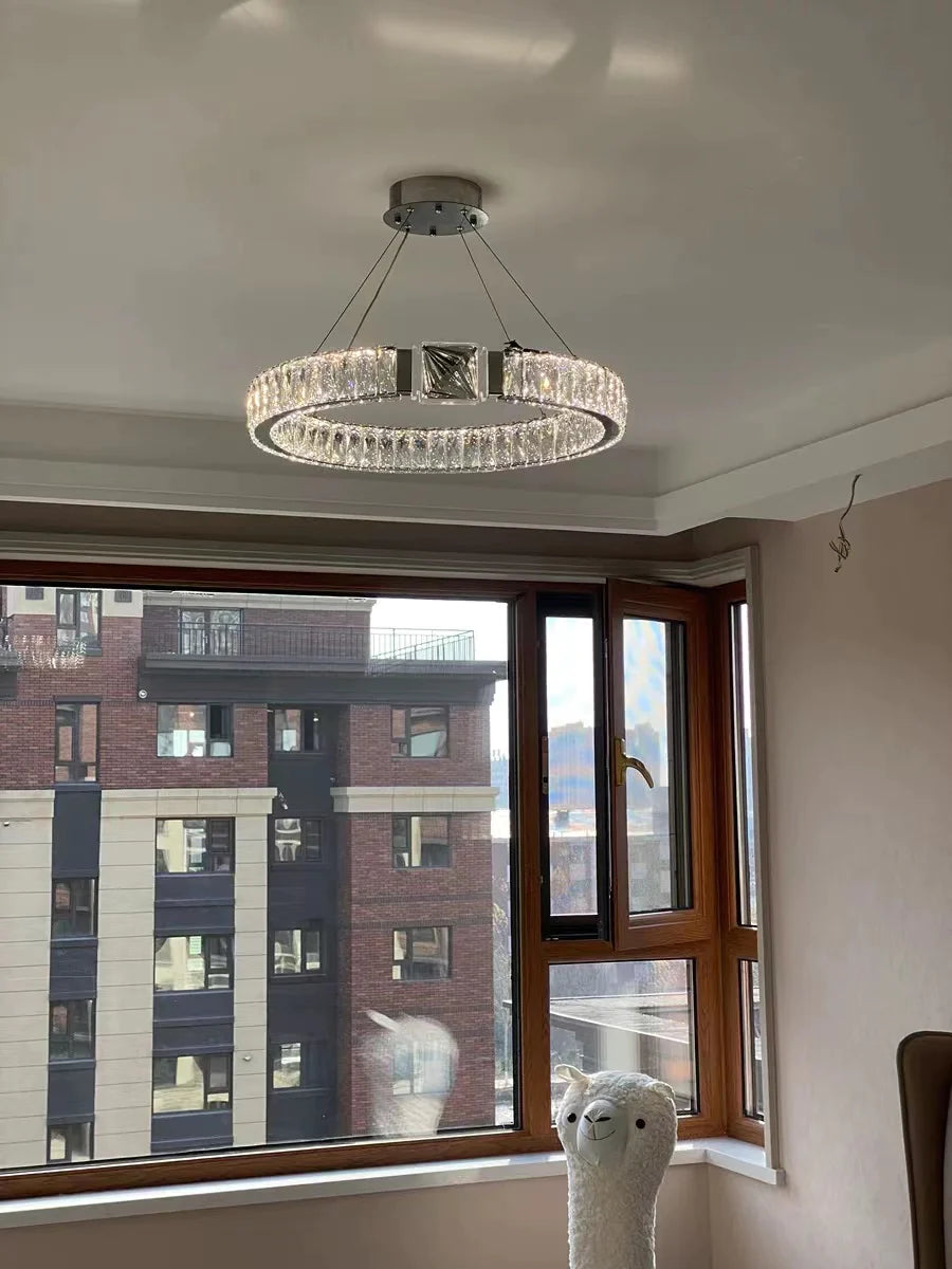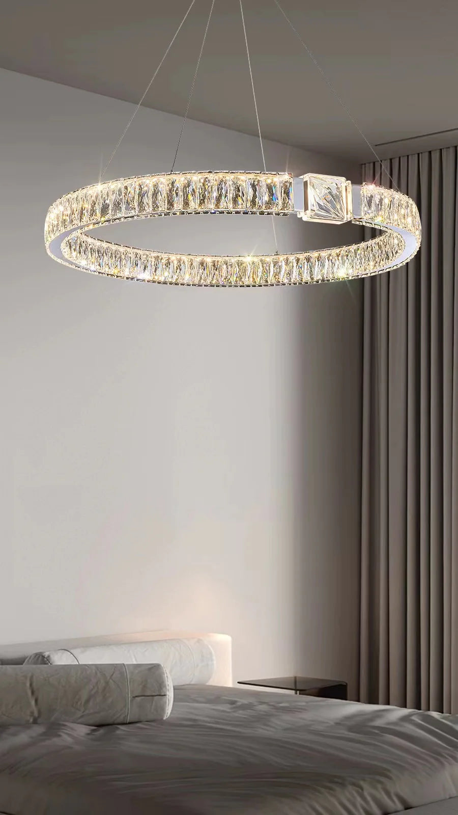 Lampadario moderno con ciondolo a forma di anello di cristallo, di lusso e leggero, adatto per soggiorno/sala da pranzo/camera da letto.