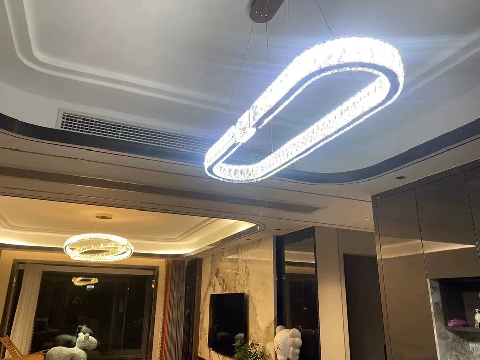 Questo set di lampadari presenta una forma ad anello con un tocco creativo. La catena pendente regolabile permette di inclinare l'anello, dandogli l'aspetto di un corpo celeste in orbita. Inoltre, gli anelli a doppio strato possono essere regolati per incrociarsi, dando la sensazione di essere nello spazio. Numerosi piccoli quadrati di tessere di cristallo si combinano per mostrare un apprezzamento per il minimalismo moderno. Un pezzo d'arredo pieno di moderna freschezza. Si può scegliere tra due tipologie: la forma rotonda è più adatta alla camera da letto e al soggiorno, mentre la forma ovale lunga si abbina bene all'isola della cucina o al tavolo da pranzo.