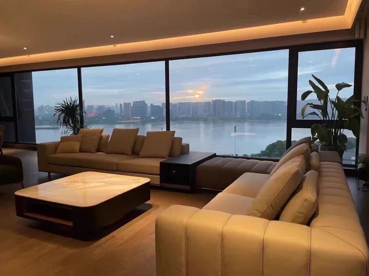 Questo divano in pelle in stile pianoforte offre una combinazione di lusso e praticità, grazie alla sua forma ergonomica e alla composizione accuratamente realizzata. Questi cuscini incorporano un rapporto 7:3 ben studiato di piumino d'oca bianca e cotone perlato per garantire un supporto ottimale e il massimo comfort. I cuscini di seduta sono realizzati in spugna SINOMAX proveniente dall'Asia orientale, che è stata migliorata da 45D a 50D per una maggiore resistenza e durata.