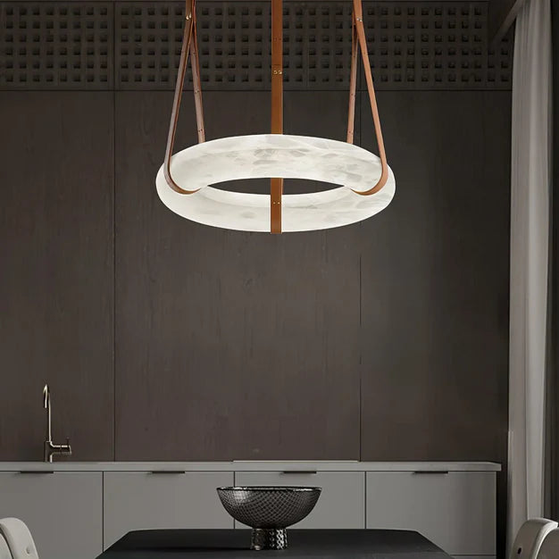 Illuminate your living room or bedroom with our Modern Round Alabaster Chandelier. The glowing alabaster ring creates a halo effect, providing a balanced and airy appearance. Individually, it brings sophistication, while in a row, it multiplies its impact. Sturdy and lightweight, it can also be hung with optional cables.